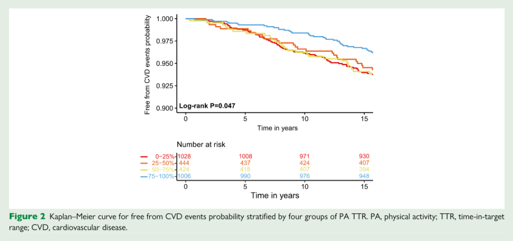 Lastly, Physical Activity Time in Target Range (PA TTR) was calculated by determining the amount of time during those 15+ years where the patients’ physical activity volume met the threshold for 150 mins/week of exercise (= 300 EUs). Patients were then categorized into four groups of 25% increments, and each of those groups were examined to assess how many cardiovascular events occurred. Secondarily, since all of the subjects who were analyzed for this study had coronary artery CT scans done, each of the four groups was examined to characterize how the level of coronary artery calcification progressed in relation to various levels of exercise output (but for the purposes of this discussion, we’ll leave this bit out).